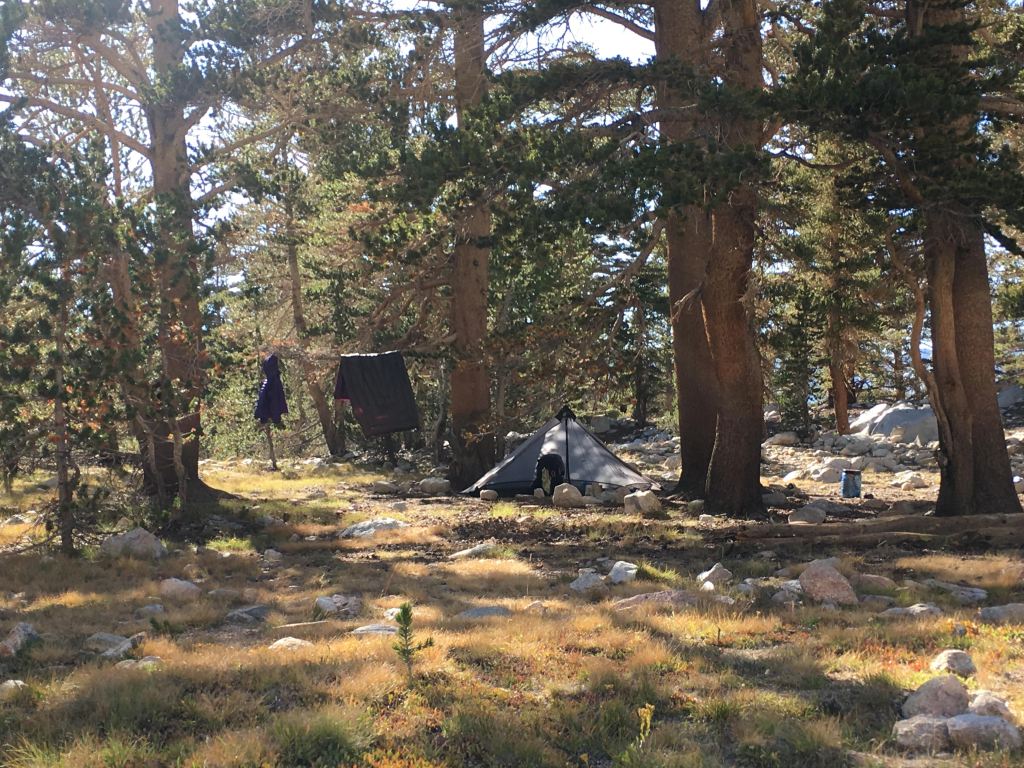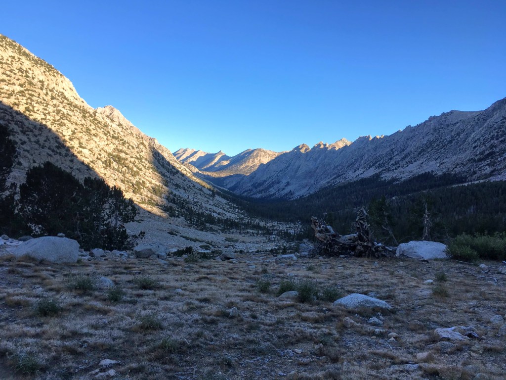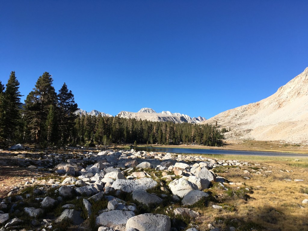 Following a 40 minute break, I started my descent, passing a steep couloir. After a few long, rocky switchbacks, the trail mellowed out at the headwaters of Tyndall Creek. Of course, every time I come over a pass like this, I have to poop, which is a problem because tree cover always begins a ways down. This valley lacked the little islands of white bark pines I usually rely on and there were no trees until lodgepole pine habitat starts.Thankfully, I made it. Then I was only a couple miles from my planned campsite at Tyndall Frog Ponds. I scout out a beautiful lakeside camping spot and camp with a friend from Mt. Williamson Motel.
