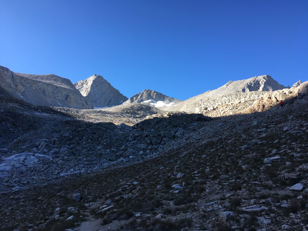 I climbed out of another U-shaped glacial valley, left the last of the trees and began the steady climb up to Forester Pass. According to the Wenk book, after you leave the last tree, you are still 2000 vertical feet below the top of the pass. I was leapfrogging with familiar faces I had camped with or met coming over Kearsarge Pass the day before. When the sun finally came up over the ridge, I took a yoga break and stretched on some granite slabs. Across the trail, another hiker cooked herself breakfast. Then, I continued on. I felt like I was moving slower and slower.