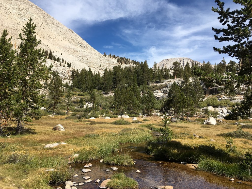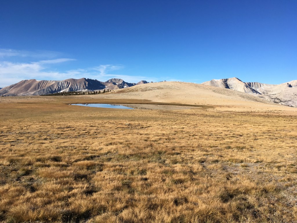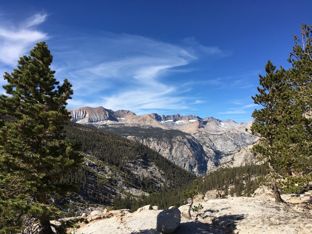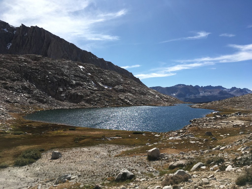 Big Horn Plateau was unlike any place else on the JMT. Dry and desert-y with 360 degree views of the surrounding peaks, grand vista because they were so far away. Having exited Kings Canyon NP over Forester Pass, the scenery was very different from the previous week. I spent almost a whole hour on the plateau taking it all in, including a 20 minute yoga session with the best views ever.
