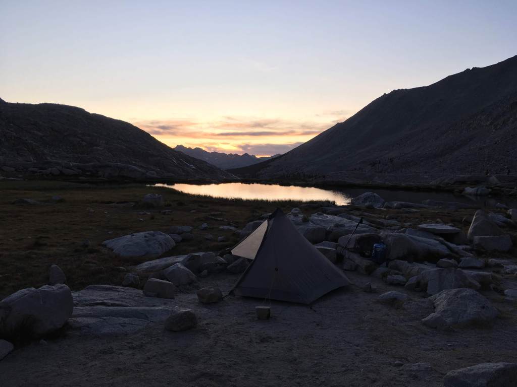 I found a quiet and excellent campsite on the bench and tarn just above the famous Guitar Lake, which was much less marginal that I expected for my last night on the trail. Guitar Lake is the last good spot to camp west of Mt. Whitney, so it is very crowded with hikers staging sunrise climbs of Mt. Whitney. Guitar Lake is at 11,500 feet. Because of overuse and the high elevation, you must bag and carry your poop out if you are heading west to Whitney Portal from about 2 miles east of Crabtree Meadow. The problem is there’s no tree cover around Guitar Lake and campsites behind every boulder so it’s not clear where one is supposed to deploy their wag bag. Do you poop inside your tent for cover then? I discuss this problem with a group of three High Sierra Trail hikers that are the only other party to camp on the bench that night. (The High Sierra Trail cuts east-west across the Sierra and also terminates at the top of Mt. Whitney.) I offer the HST hikers some stroopwafels and they are super happy, incredulous that I have extra food, since they packed really light. I’ve had too much food this whole trip! I try to convince them to climb Mt. Whitney for sunrise. We lounge on a dip in the granite on the edge of the bench shaped like a sectional couch and watch the sun set. Then I retire to get an early night for my early start.