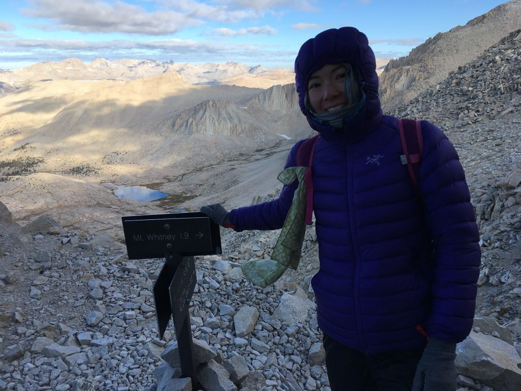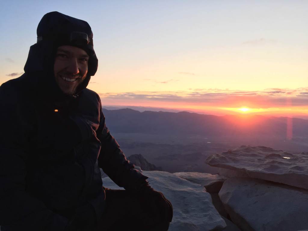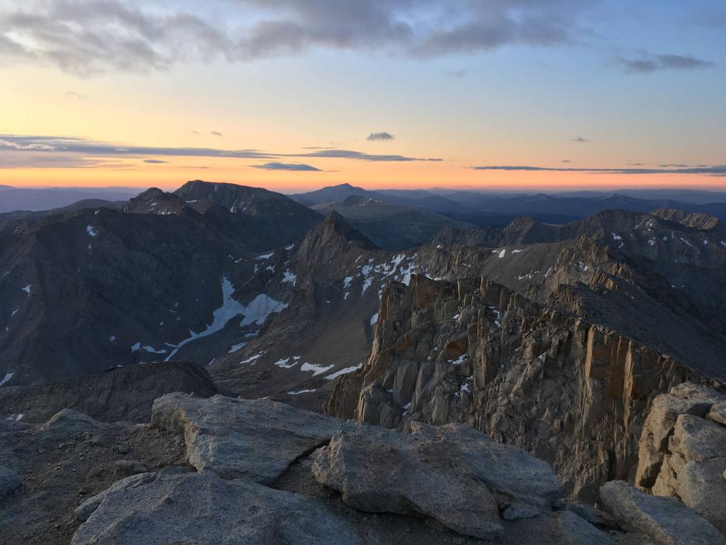 When we can see light through the window, we all head outside to watch. I sit on my Thinlight foam pad folded into a sit pad to insulate me from the cold granite but it still gets really cold, so I pull out my emergency blanket. It is unwieldy because it is so windy on the summit, but I gradually manage to gather it around me and it does help. But after a while my toes still get so painfully cold I give up and go back to the shelter to rewarm, jumping up and down out of the wind. I meet another solo JMT hiker, Justin, who comes in to warm his hands by doing pushups. His phone is dead, so when we head back out and the sun does come up, I take some photos to send him and he takes some of me in return.