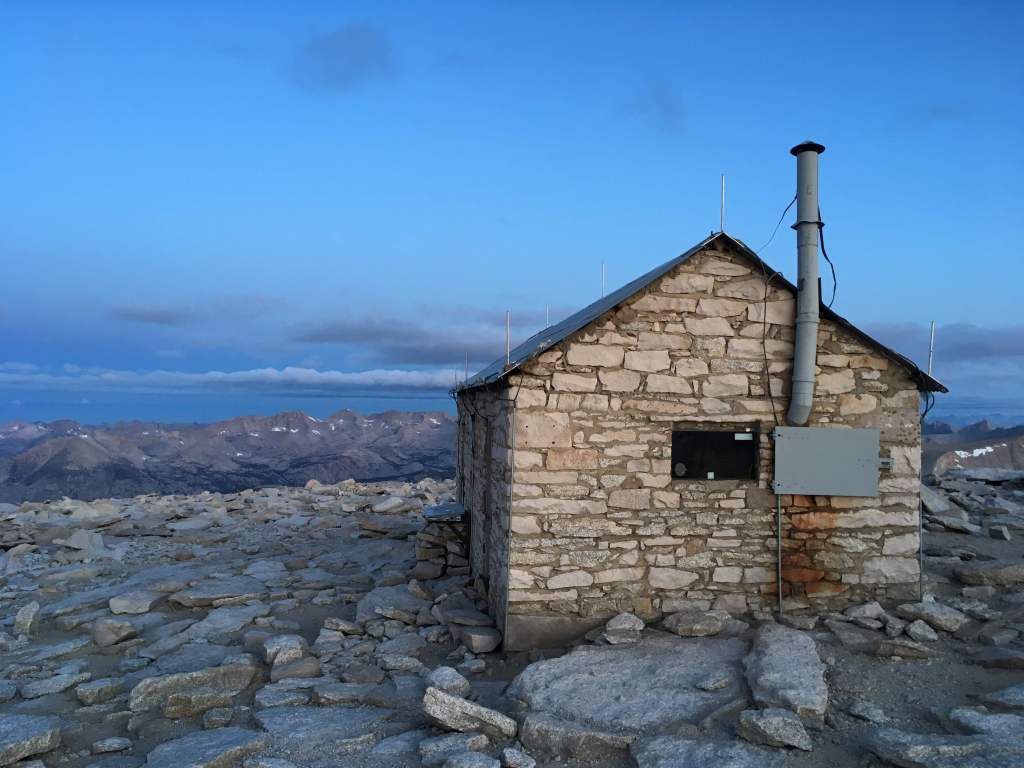 Surprisingly, no one passes me the entire climb up the Whitney trail, though I did see some headlamps bobbing below me. Finally, my headlamp reflects off a white granite wall of the Whitney Summit Shelter. I switch my headlamp light to red and stumble inside. Inside are five other people freezing their asses off. Three of them had the foresight to bring their sleeping bags and they still look cold. It is 5:40 AM. The horizon is beginning to glow. I put on my rain pants and rain jacket over my hiking clothes and sip my coffee, which is still pretty warm but doesn’t seem to have any effect warming me up.