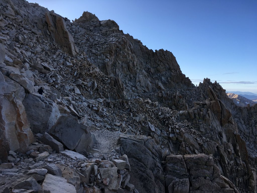 It gets so cold that I stop to put away my trekking poles so I can put my hands in my puffy jacket pockets. My wool glove liners are inadequate. And then suddenly I am at Whitney Junction. It is just after 4 AM. Taking my summit pack, I head up the 1.9 mile trail to Whitney summit. The summit pack feels so light I check a couple times to make sure I remembered to bring my water bottle. The trail skirts the west side of the ridge and is full of large boulders. These must be from the many rockfalls/rock slides that have occurred over the last hundred years. We don’t do trail building like we used to (during the Great Depression). When the trail becomes unclear, I sweep the surroundings with my headlamp and always manage to find it again.